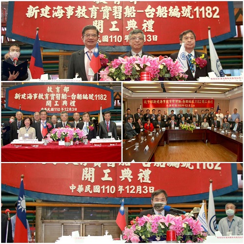 【記者吉雄世/高雄報導】教育部委由台船公司建造海事教育實習船,110年12月3日上午10點30分於台船公司高雄廠舉行開工典禮。典禮由教育部劉孟奇政務次長與台灣國際造船公司鄭文隆董事長共同主持,國立高雄科技大學協辦,亦邀請國立臺灣海洋大學、台北海洋科技大學等國內各海事相關大學院校參與。