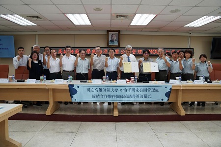 【記者吉雄世/高雄報導】國立高雄師範大學攜手海洋國家公園管理處,為共同推展海洋環境教育,於11月17日上午假高師大和平校區行政大樓六樓會議室,由吳連賞校長與徐韶良處長分別代表雙方簽署「合作協議」備忘錄。邀請營建署署長吳欣修、高師大副校長廖本煌、主任秘書黃有志、理學院院長洪振方、海管處副處長林欽旭、科長王君如等近三十位賓客出席,共同見證這歷史性的一刻。未來雙方將以拓展夥伴關係,建立人才、設備、場地及行政資源合作模式,緊密合作期望共創多贏。