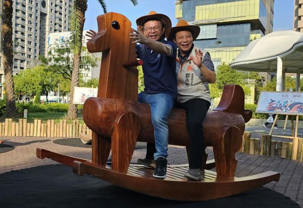 圖2:利用颱風風倒木製作的大型木馬,受到大小朋友喜愛,圖為高雄市政府農業局姚志旺局長(左)與屏東縣政府農業處長鄭永裕(右)開心騎木馬。