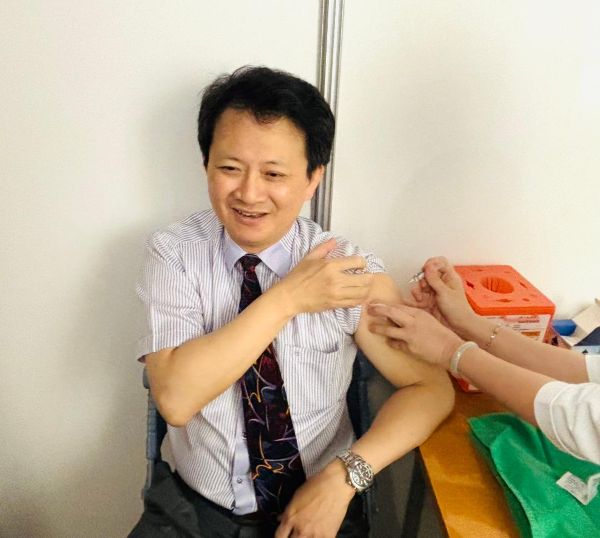 圖說2:高醫王照元院長挽起袖子率先接種,他也呼籲罹患重症的高危險群,包含孩童、孕婦、老年人、重大傷病及慢性疾病等,接受疫苗注射是預防流感及新冠肺炎的最佳方式。
