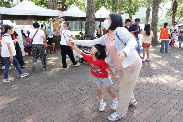 圖3:伊甸無障礙生活節民眾戴模糊眼鏡打羽球,體驗視障朋友的不易。