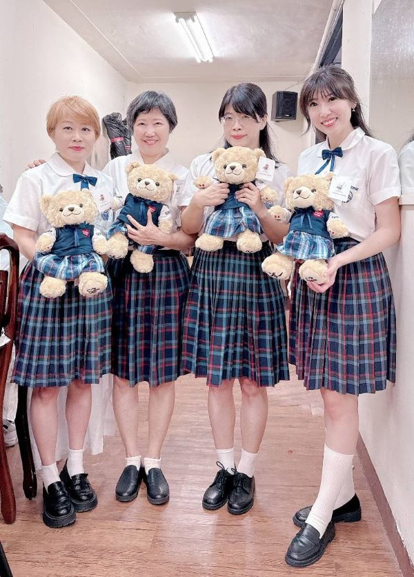 圖說2:文藻2025校友回娘家活動中最吸睛的亮點之一,是由剛滿70歲的校友換上學生時代的白上衣與花格裙制服,與各屆校友代表及在校學生一同穿上制服,並戴上面具讓大家猜猜誰是誰。圖由右至左依序為第35、25、5及15屆校友。
