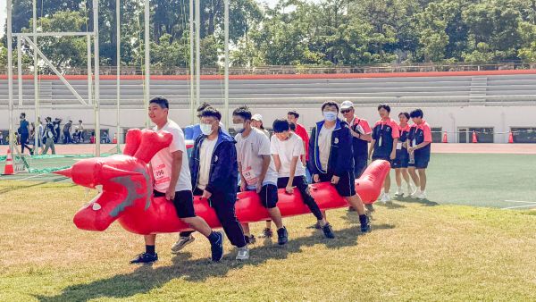 圖說6:趣味競賽登場,參賽者齊心協力挑戰陸上充氣龍舟挑戰賽,現場笑聲與加油聲不斷,展現團隊合作與運動樂趣。