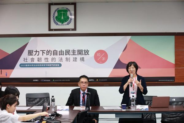 國科會法律學門召集人、臺大教授孫迺翊致詞表示,本次研習活動旨在凝聚各領域學者交流與合作,讓刑法、民法、憲法及公法等不同研究方向能共享成果、拓展視野。她指出,本次主題呼應臺灣民主化後的現實挑戰,法律制度在維持開放與自由的同時,也須具備「防衛性民主」的力量,以防止外部威脅侵蝕民主根基。孫迺翊強調,現代威脅不僅來自武力,也包括資訊戰與經濟滲透,唯有結合國際公法、刑法、財經法與社會法等跨領域研究,才能建構具韌性的法治體系,使民主社會在壓力下仍能穩定前行。