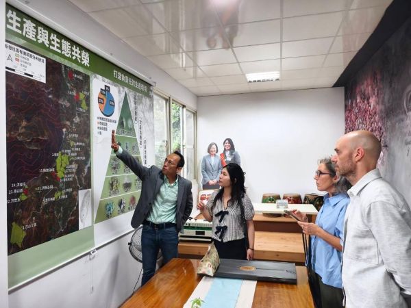 圖2:苗栗雪見高山茶製茶師張立欣(左1)帶領AVPA評審主席Carine Baudry(左2)與技術評審Florian Aumaire(右2)南下六龜實地訪查,於「燿興原生山茶咖啡工坊」合影。
