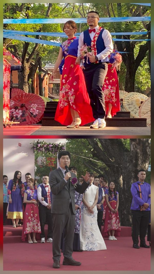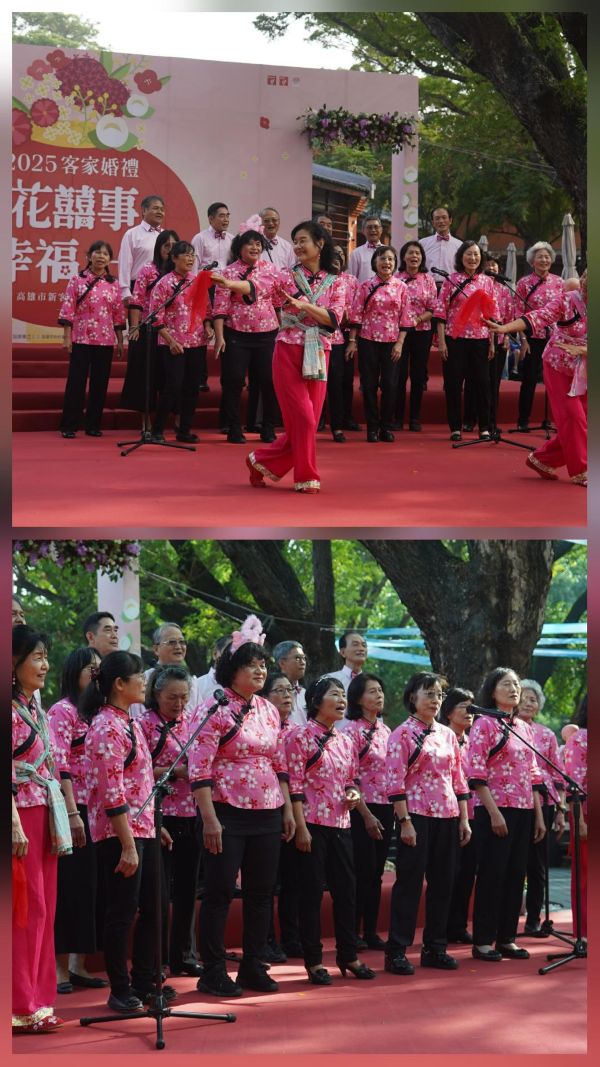 高市府客委會楊瑞霞主委則說今天現場之所以感到「熱」,不是因為天氣,而是新人與來賓的熱情感染了每一個人。今年特別以雨豆樹步道為紅毯,讓新人在綠蔭與祝福中亮相,並以步道兩旁的油紙傘,寓意圓圓滿滿及期待新人同心協力為家人撐起幸福的未來,提醒新人要互相尊重、互相扶持,並祝福大家多子多福、早生貴子。高雄客家婚禮舉辦已 12 年,共見證逾四百對新人,她也期盼未來能「一起回娘家」,讓更多家庭參與這份幸福。