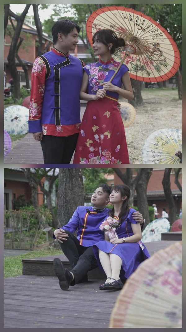 新人們在八音悠揚的樂聲與象徵為新人「起家」的帶路雞引領下沿著綠蔭搖曳的雨豆樹步道緩緩進場,彩旗輕舞、光影流轉,典雅的客家禮服在自然光線中展現傳統與時尚交融的獨特韻味。典禮隨後依循傳統儀式進行「上燈」,象徵家族興旺與香火延綿;「插頭花」及「食新人茶」,是重要的認親與敬茶儀式,長輩的祝福與叮嚀化作期待,也連結起兩個家族共同迎向新生活的深厚情感。