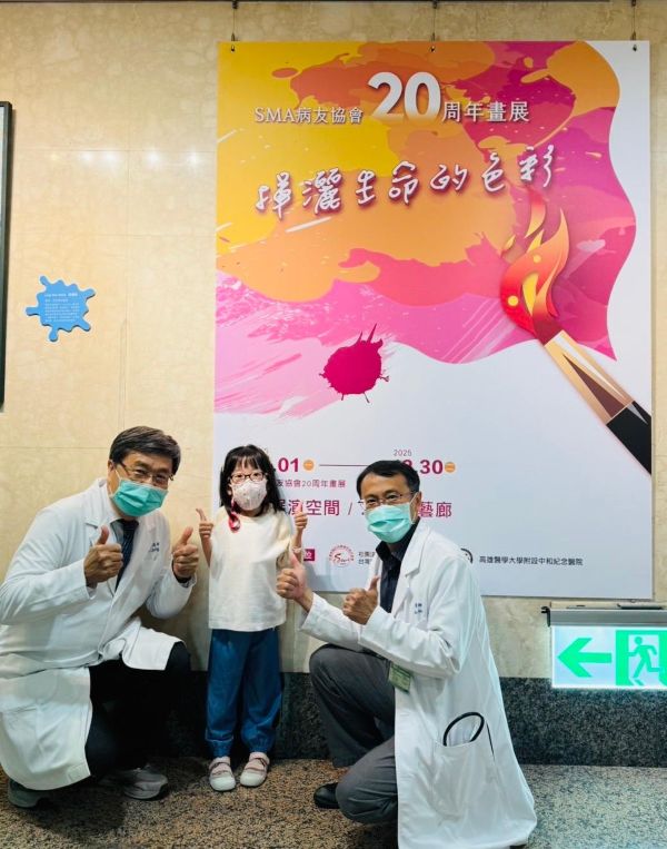 - 今年適逢台灣SMA病友協會創立20週年,協會特別攜手高醫於南杏藝廊推出暖心畫展「揮灑生命的色彩」;高醫是全台長期投入SMA病友照護的醫療團隊之一,其中小兒神經科鐘育志教授(左1)更是台灣SMA病友協會創會理事長,右1為高醫小兒一般科主任施相宏醫師,右2為今年小學3年級的第一型SMA病童吳羽恭。