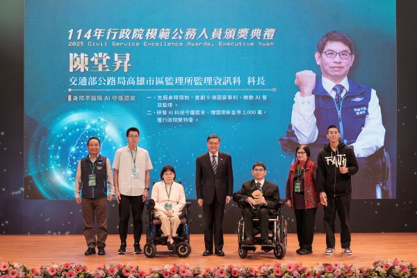 【記者吉雄世/高雄報導】交通部公路局高雄市區監理所資訊科陳堂昇科長表現傑出,受交通部推薦、榮獲「114年行政院模範公務人員」殊榮,並於12月3日前往行政院人事行政總處公務人力發展學院,接受行政院長卓榮泰頒獎表揚。陳堂昇科長長期深耕監理業務數位轉型,積極研發與挑戰創新,首創9項國家專利,並致力於推動各項公路監理業務智慧化。