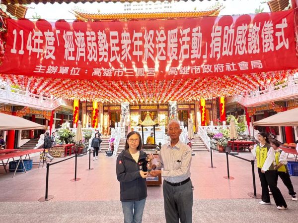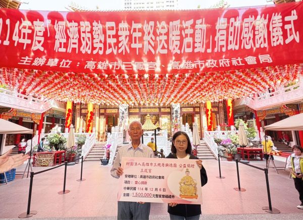 【記者吉雄世/高雄報導】歲末時節寒意漸濃,12月6日高雄市政府社會局三民、新興、左營及楠梓4個社福中心與財團法人高雄市三塊厝興德團(三鳳宮)公私協力,假三鳳宮三川殿共同辦理「年終送暖活動」,由財團法人高雄市三塊厝興德團(三鳳宮)捐贈150萬元家樂福禮券,協助社會局服務中的500戶弱勢家庭,安心安家安神,勇敢邁向來年,活動現場洋溢溫馨與感恩氣氛。