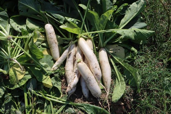 活動中,孩子們蹲下身、小手握著蘿蔔葉,努力將蘿蔔從泥土中拔起,「媽媽,這根蘿蔔長得好像馬鈴薯哦,胖胖的~」,當一根根潔白飽滿的蘿蔔被拔出時,孩子們的驚呼聲此起彼落,臉上滿是收成的喜悅與成就感。蘿蔔的客語是「蘿蔔仔(loˇ ped eˋ)」,以生活化方式引導孩子認識客語,讓語言學習自然融入。午餐選用在地新鮮食材,孩子們開心地享用Q彈的客家炒粄條,熱騰騰的蘿蔔湯清甜爽口,邊吃邊讚嘆「好甜!」,透過簡單樸實的客家風味,也能在餐桌上認識客家的米食料理及「惜食、敬天、感恩土地」飲食精神。