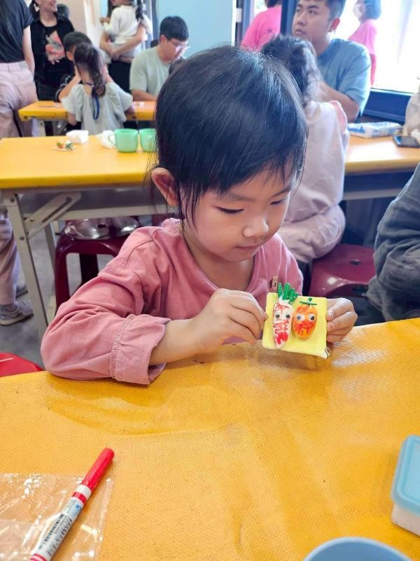餐後前往美濃客家文物館,進行輕黏土磁鐵DIY。志工老師講故事〈麼人好食白玉蘿蔔〉後,家長與孩子們分組創作,是白玉蘿蔔與澄蜜香小番茄造型,小手拼貼,每個孩子都完成獨一無二的作品。
