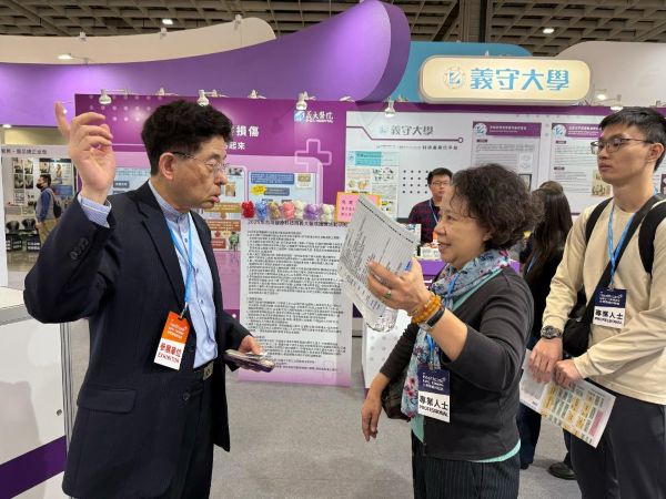 展出聚焦義守大學多項具高度應用價值的專利技術,充分展現校方將學術研究轉化為解決臨床與照護痛點之創新方案的能量。在智慧復健與診斷科技領域,義守大學呈現了 AI 資訊輔助臨床決策的最新成果。針對中樞神經損傷者的復健需求,生物醫學工程學系王智昱老師與輔大職能治療學系劉倩秀老師團隊開發的「上肢動作失能之量化評估系統」專利,結合IMU感測與 AI 演算法,能提供客觀且精確的FMA量化評估結果;同時,義大職能治療學系李秉家主任團隊研發「運用於中風個案之混合實境上肢創新復健系統(MR.URS熊熊皮飲料吧)」專利,採用 MR 技術與遊戲化情境,有效提升患者的復健動機與療效。在精準輔助診斷方面,電機工程學系吳榮慶老師的「注意力不足過動症評估系統」專利,以非干預式監測為核心設計,能提供更客觀的診斷依據,並具高度遠距醫療應用潛力。在醫學教育核心能力的奠基上,機械與自動化工程學系顏仲崑老師團隊打造的「仿真膽道內視鏡結構 3D 列印模型」,提供高擬真訓練場景,顯著提升臨床技能培育品質。學士後醫學系劉麗芬老師團隊與義大醫院合作開發的「高通量 3D 細胞球體載盤」專利,更為藥物篩選、疾病模型研究與新藥開發等生技研究鏈結建置具產業競爭力的臨床前測試平台。整體彰顯義守大學在智慧醫療、復健科技、生醫材料與醫學教育等面向的堅實研發能量,持續推動南臺灣醫療科技創新的深度與廣度。