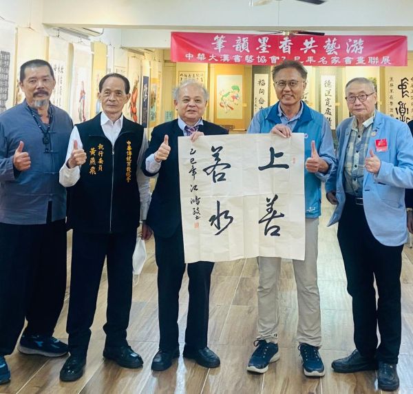 圖說1:「中華大漢書藝協會乙巳年名家書畫聯展——筆韻墨香共藝游」於八卦山大佛台灣孔子研究院展廳展出期間,與會貴賓合影留念。展覽集結多位書畫名家作品,並獲地方文化界與社會賢達支持,共同推動藝文扎根地方、走入公共空間。圖中左一 為非營利組織聯合總會主席張連興;(圖中)身著淺藍色背心者為彰化縣文化局副局長吳文昇。