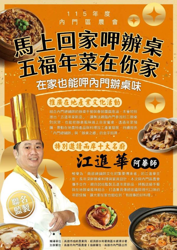 【記者吉雄世/高雄報導】素有「台灣總鋪師故鄉」美譽的高雄市內門區,每逢春節大年初二舉辦的「回娘家呷辦桌」活動,長年為全台年節指標盛事。為迎接 2026 年春節,高雄市政府農業局輔導內門區農會,除延續廣受歡迎的實體辦桌外,更首度推出多款外帶年菜新品,打破時間與空間限制,讓民眾在家也能品嚐道地的內門總鋪師手路菜。內門「初二歡喜回娘家 駿馬奔騰呷辦桌」活動即日起接受預訂(訂購專線:07-6672161、6673737),數量有限,欲購從速。