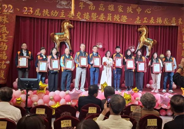 【記者吉雄世/高雄報導】南高雄家扶中心於115年1月10日在南北樓林森店辦理「珠氣蓬勃扶滿載,綺開得勝贏未來」第22、23屆扶幼主委交接及委員、志工幹部授證暨歲末聯誼活動。現任主委莊月珠將身上象徵力量、前進、榮耀、承諾等配件,由新任主委賴曼綺一一穿戴上身,並且在家扶基金會謝武吉監事、周大堯執行長、高雄市政府社會局葉玉如副局長,以及全體扶幼委員的見證之下,正式接任南高雄家扶中心第23屆扶幼主委一職。社會福利工作任重道遠,賴曼綺承諾會守護前主委們所累積的成果,更會成為所有社工的後盾,為更多的弱勢家庭與兒童,帶來平安與更好的未來。