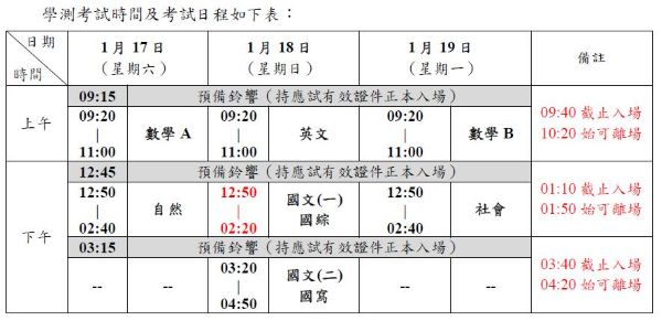 高雄大學提醒,學測試場於1月16日下午 2 時至 4 時開放查看,考生可於規定時間內前往試場外查看座位配置,但不得進入試場;請考生事先確認考試地點與動線,考試當日提早出門,避免因交通壅塞或人潮影響應試。
