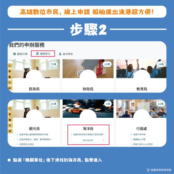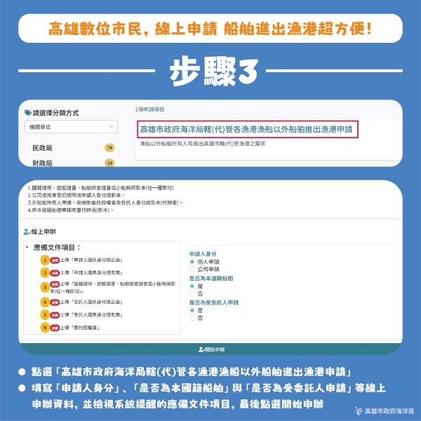 海洋局呼籲,凡屬漁船以外之船舶,進出本市各港口時,請優先透過「高雄數位市民網站」(https://ktc.kcg.gov.tw)路徑:市政服務/申辦服務/機關單位/海洋局/高雄市政府海洋局轄()管各漁港漁船以外船舶進出漁港申請,辦理線上申請,共同落實漁港管理數位化,攜手打造高效、便利的漁港環境。