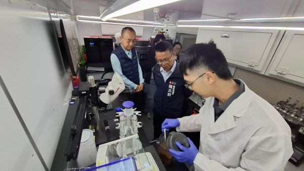 圖2-4::農業局長姚志旺與梓官區農會總幹事林逸昌視察行動質譜車檢驗流程,行動質譜車可提供免費且速度快、準確度高的農藥殘留檢驗服務,協助農友即時掌握自家農產品安全狀況,守護食品安全。