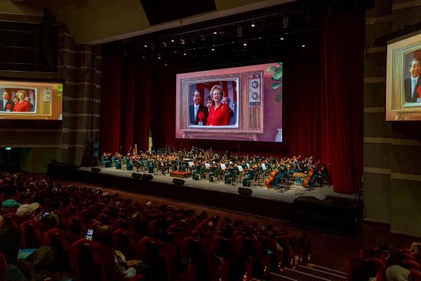 圖說八:長榮交響樂演出英國作曲家艾爾加的《威風凜凜進行曲》,這首被譽為「英國第二國歌」的曲子同時也是張創辦人與英國鐵娘子柴契爾夫人最喜歡的曲目之一,張創辦人曾說每次聽到這首曲子,就會想起他在遠方的老友─柴契爾夫人,現場播放了許多珍貴畫面,也訴說了兩位摯友堅毅的友情,讓觀眾津津樂道。