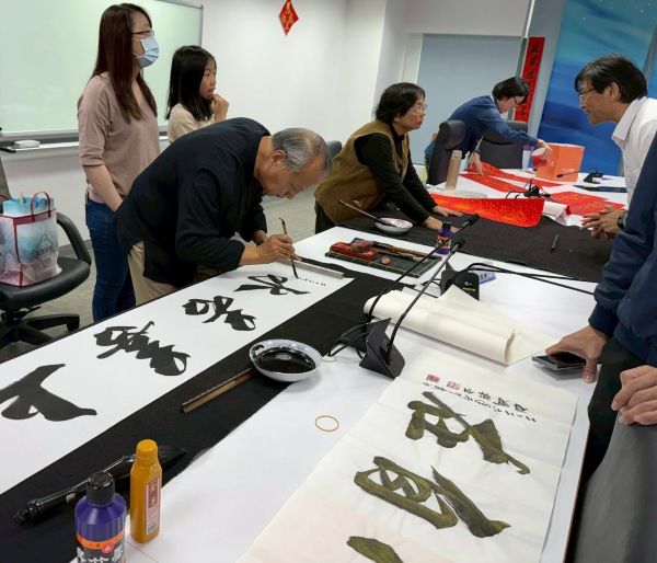 由管碧玲帶領所屬機關單位主管們齊力揮毫,寫下新春祈願,透過筆尖,傳達出「廉潔自律、守護海洋」的決心外,還特別邀請海巡退伍的謝國棟先生,攜手數名書法家揮毫「廉政標語」春聯贈予同仁,象徵廉潔文化傳承。謝國棟先生於89年至105年服役高雄海巡隊,他表示之前在海上執勤,對於海洋有深厚的情感,今日拿著毛筆回娘家,這每一撇一捺寫的都是對海委會最深的祝福。