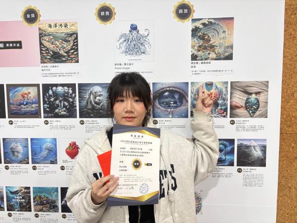 「AI組」金獎由光復高中朱婉琪奪得,作品《海洋污染》以浮世繪工筆風格描繪海洋垃圾對生態的威脅,透過暗色巨鯨與群魚的強烈對比,揭示美麗表象下潛藏的污染真相,喚起大眾守護海洋的共同責任;銀獎由景文高中謝玟慧獲得,其作品《Plastic Ocean》以塑膠垃圾拼組成章魚形象,象徵海洋已逐漸被人類廢棄物佔據,呼籲社會正視日益嚴峻的海洋污染問題;銅獎則由嘉義高商侯芸蓁榮獲,作品《武海》以武士揮刀守護遭塑膠吞噬的海洋為意象,點出人類在環境保護中責無旁貸的角色。