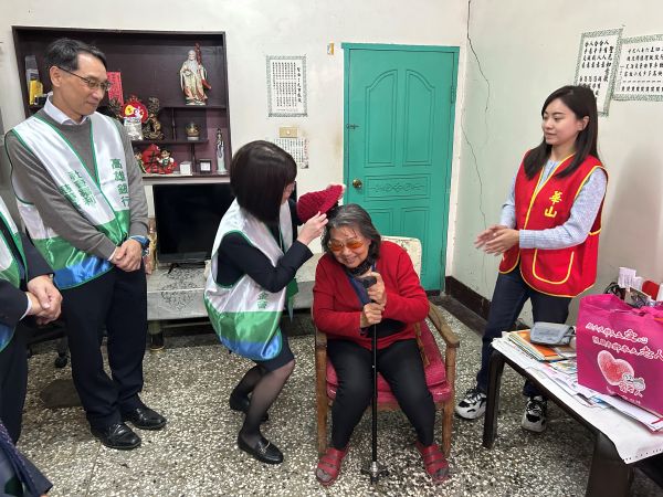 獨居高雄左營區80歲的符奶奶,原為華山基金會義工,因為年長骨質疏鬆、眼部病變,轉而成為被服務的對象,內心很是難過失落。在華山站長及義工的陪伴下,奶奶走出人生低潮,心情也逐漸開朗。農曆年前,適逢寒流來襲,高雄銀行張代理總經理榮泰先生帶領同仁到奶奶家送上全新的棉被,並由凃副總經理送上愛心年菜,人力資源處溫處長為奶奶戴上義工親手編織的毛線帽,接著大家一起為奶奶家大掃除並貼上春聯,除舊佈新、獻上祝福,讓奶奶提前感受有家人一起團圓過年的氣氛。