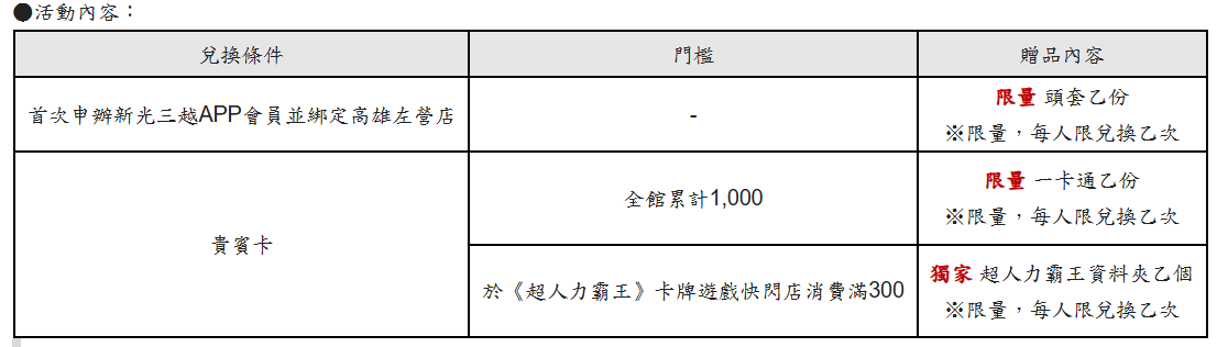 行銷副理蔡坤昇表示,希望透過與「高雄冬日遊樂園」的跨域串聯,打造「高雄首站親子玩樂場域」,讓顧客(會員)白天逛百貨、晚上賞燈會,一日享受豐富多元的年節行程,創造城市觀光與百貨商機雙贏。活動期間推出多項會員限定好禮:首次申辦新光三越APP會員並綁定高雄左營店,即贈超人力霸王限定頭套乙份;當日持貴賓卡全館消費累計滿1,000元,即贈超人力霸王精美一卡通乙份;即日起-3月1日快閃店期間持新光三越會員至10F展區消費滿300元即贈獨家限量超人力霸王資料夾乙份,讓大小粉絲在逛展同時也能把專屬紀念帶回家。