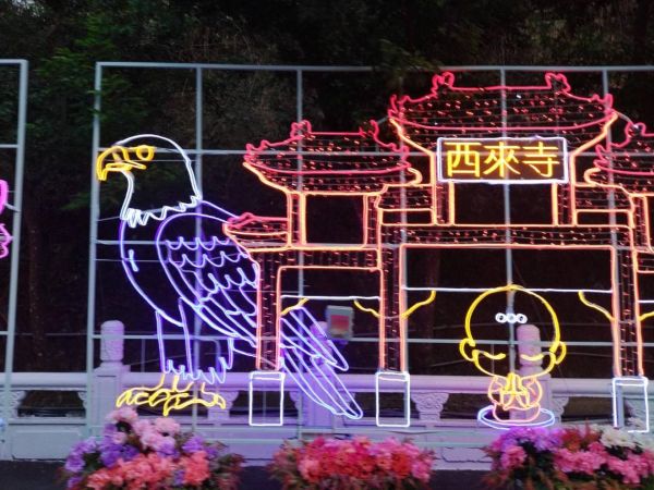 圖說9:燈會裝置藝術融合童趣與傳統元素,「西來寺」字樣與光影設計展現文化創意,吸引民眾駐足拍照留念,體驗新春歡樂氛圍。