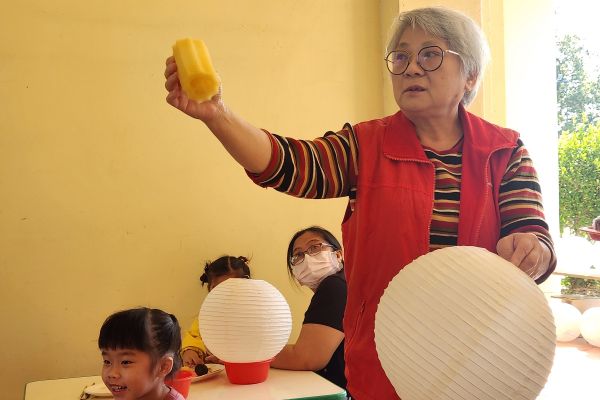 慢飛天使3歲半「小安」的外婆,同時也是這次活動教學老師。2歲時,「小安」媽媽發現孩子有發展遲緩的現象,去年9月進入旗山早療中心就讀。在早療協助下,目前「小安」能自己整理物品,跟隨著班級同儕參與課程活動,每一天都很期待上學。外婆身為美濃花燈職人團隊成員,在課程教學時也觀察到,孫子在學習上漸入佳境,希望假以時日能跟得上同齡孩子的腳步。