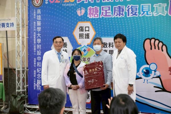 5.病友陳先生現身分享治療歷程,感謝高醫團隊成功協助控制骨髓炎、保住肢體功能,重拾行走能力,現場並致贈祝福禮品,象徵重獲健康新生。(左至右:高醫郭耀仁教授、病友家屬、病友陳先生、外科部李書欣部長兼整形外科主任)