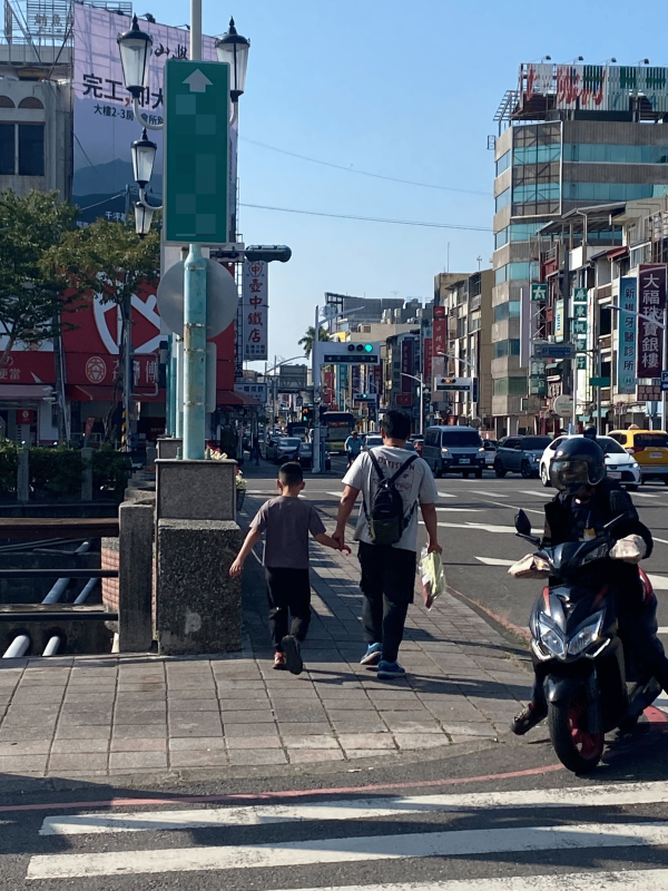 圖3:展望會社工正昌(右)特地開近一小時車程,接送小城到眼鏡行,結束後牽著他小小的手過馬路,一路陪伴,確保孩子順利完成驗光與鏡片挑選。(台灣世界展望會提供)