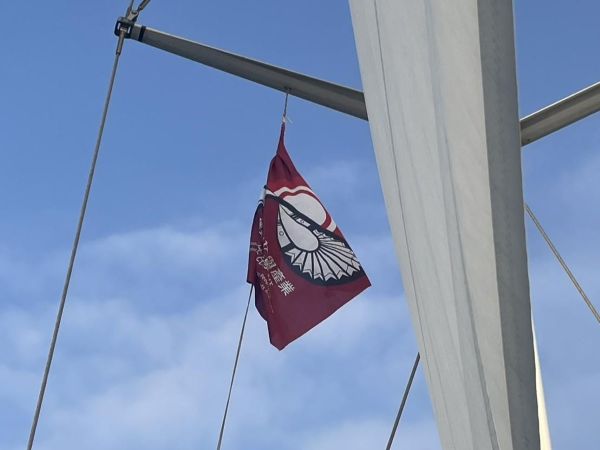 圖2:高師大運產班系旗高掛在迎接船上。