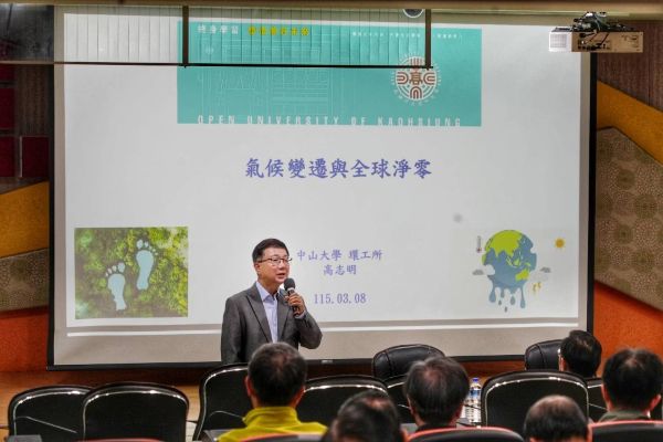 為提升教師專業知能與永續發展素養,高雄空大舉辦114學年度第2學期教師成長研習活動,邀請國立中山大學環境工程研究所高志明講座教授,以「氣候變遷與全球淨零」為題進行專題演講,深入剖析全球氣候變遷趨勢與淨零排放發展方向,現場交流熱烈。高雄空大校長陳月端致詞表示,高志明講座教授是淨零碳排領域首屈一指的學者,感謝他的蒞臨,為全校教師帶來這方面全球最新的資訊與觀念。