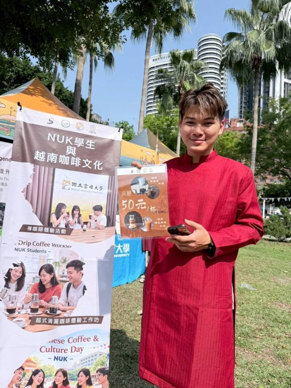 第二天(3月7日)由國際事務處帶領越南學生會設攤,推出深受歡迎的越南冰滴咖啡文化體驗。學生透過Phin濾杯沖煮示範,向民眾介紹越南咖啡文化與慢活生活哲學,並從成本規劃、咖啡製作到攤位營運全程參與,展現國際學生在校園學習與城市交流中的多元參與。