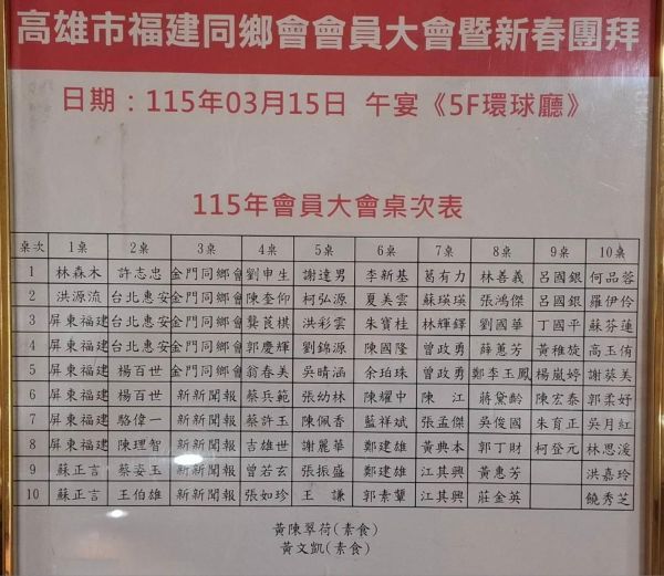 【記者吉雄世高雄報導】高雄市福建同鄉會第十三屆第四次會員大會曁新春團拜於115年3月15日上午在寒軒大飯店5樓《環球廳》舉行會員大會之後進行午宴聯誼,各同鄉會、友好單位和許多議員等嘉賓雲集,原定10桌春酒宴席,追加到12席。當天蒞臨盛會的單位有:屏東福建同鄉會、台北惠安同鄉會、金門同鄉會、廣東同鄉會、南澳同鄉會、新住民協會、31省同鄉、海南同鄉會以及台灣新新聞報。親自蒞臨祝賀的有:同燕珍議員、曾麗燕議員、蔡金宴議員、陳麗珍議員、陳麗娜議員、陳若翠議員、陳美雅議員、陳玫娟議員、李順進議員、李雅靜議員,以及洪塔美、吳卓政、王金星、陳韻晴等顧問群。立法委員柯志恩、陳菁徽均派助理前來祝賀。