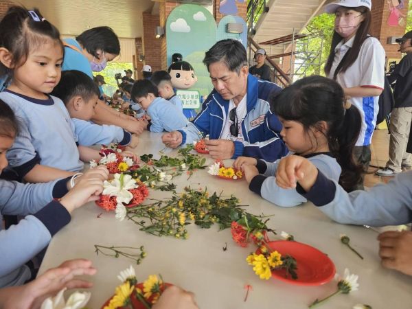 3月20日伯公生當天,中心於開基伯公區舉行遵循客家禮俗的三獻古禮祭儀,並邀請「大夥房藝術團」現場演奏傳統客家八音古樂(打八音),展現莊重而溫馨的祭祀氛圍。同時有近百名幼兒園的小朋友參與盤花教學體驗,在老師指導下將花卉一層一層堆疊成盤花,再將親手完成的盤花敬獻伯公,讓孩子在實際參與中認識並感受客庄代代相傳的文化禮俗。