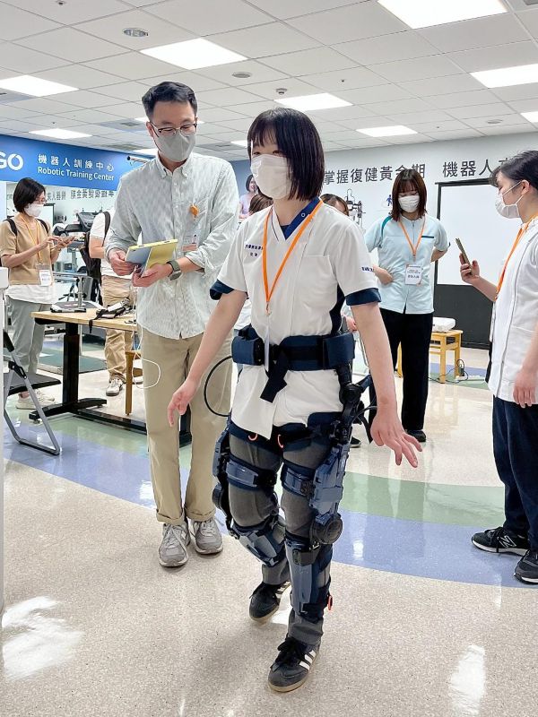 圖說三:日方學生在復健科物理治療師陳浩帶領下,穿戴體驗外骨骼復健機器人,了解高醫岡山醫院如何將智慧科技應用於臨床復健訓練。圖/高醫岡山醫院提供