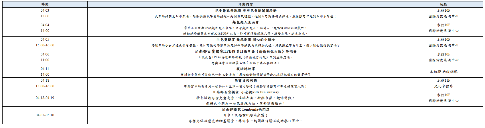 不僅如此,檔期更結合兒童節邀請大小朋友最愛的乖乖兒童節闖關活動,以及日本超人氣國民動畫《麵包超人》見面會熱鬧登場,集結卡通明星與親子家庭同歡,打造吃喝玩樂一次滿足的連假玩樂地標!