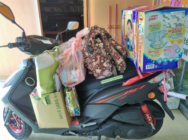 圖2:小小一台機車,前後堆滿紙箱、尿布等物資,幾乎沒有多餘空間。玟瑗仍想辦法把滿滿的物資送進每一戶服務家庭。(台灣世界展望會提供)