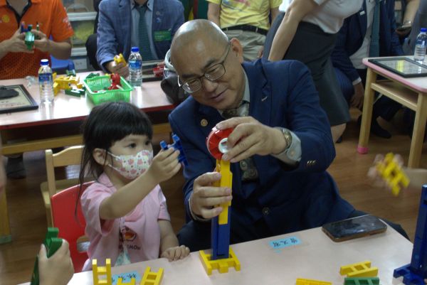 圖2:大發扶輪社呂博進社長與鳳山早療的孩子共同完成積木創作