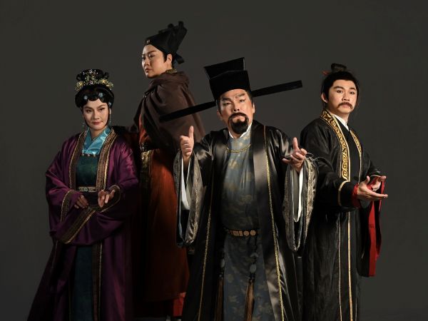 圖4:國立傳統藝術中心臺灣豫劇團《東窗謀計》演出(左起)劉建華飾宋王趙構、殷青群飾秦檜、蕭揚玲飾王氏、林文瑋飾岳飛。