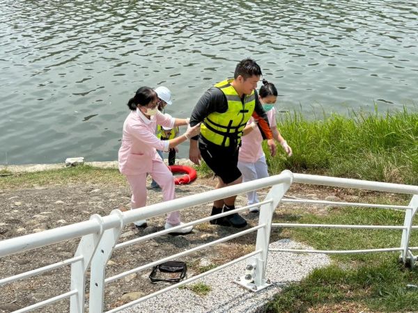 防汛救援: 模擬颱風期間民眾不慎落水,即時啟動消防局第四大隊右昌分隊支援救援。
