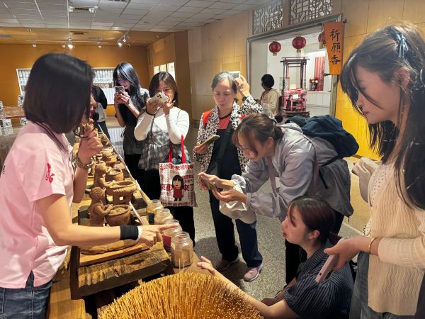 實地課程安排學生走訪香藝文化園區,透過製香、品香與香包製作等活動,從感官層面理解「香」在宗教文化中的象徵與情感連結;下午則進入遶境核心場域,沿新港地區路線參與活動,跟隨香燈腳步伐隨行,並於新港代天宮周邊進行觀察與體驗,實際感受遶境隊伍的行進節奏與集體儀式,並參與「鑽轎腳」等傳統文化行為。在人潮推進與儀式節奏之中,學生不僅是觀察者,更成為文化現場的一部分。