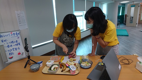 服務對象暫別日照中心後,讓人憂心的是好不容易建立起的穩定作息因居家防疫而有所影響,於是社工與教保員特別設計了視訊課程,另配合每日電訪掌握服務對象狀態,讓服務與關懷持續進行。先和服務對象聊聊天,再開始上午的保健課程,教保員拿著齒模教服務對象在鏡頭前跟著刷牙,保持口腔衛生。下午可以輕鬆一下來份下午茶,特別設計親子DIY課程來教做水果優格,除了讓憨兒們的居家防疫生活充實又規律,更可減輕家庭照顧者負擔。