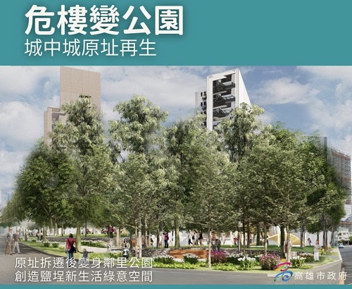 後續市府將在12月透過都市計畫變更,將城中城現址變更為鄰里公園,而面臨城中城大樓周邊第一排建築物亦一併進行牆面整建維護更新,蛻變為鹽埕舊市區新生的起點。愛河對岸的七賢國中舊校址,也將做為區段徵收抵價地配地及社會住宅基地。市府並與國家住宅及都市更新中心合作,將興建600戶社會住宅,優先供城中城大樓無房屋所有權的住戶租住,以保障相關權益人的居住權及財產權。新建社會住宅臨近幸福川而居,區位環境佳,且未來將引入日照中心、共享青創空間等供鄰里使用,以維持社區良好互動。