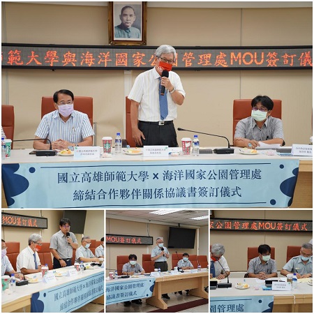 【記者吉雄世/高雄報導】國立高雄師範大學攜手海洋國家公園管理處,為共同推展海洋環境教育,於11月17日上午假高師大和平校區行政大樓六樓會議室,由吳連賞校長與徐韶良處長分別代表雙方簽署「合作協議」備忘錄。邀請營建署署長吳欣修、高師大副校長廖本煌、主任秘書黃有志、理學院院長洪振方、海管處副處長林欽旭、科長王君如等近三十位賓客出席,共同見證這歷史性的一刻。未來雙方將以拓展夥伴關係,建立人才、設備、場地及行政資源合作模式,緊密合作期望共創多贏。