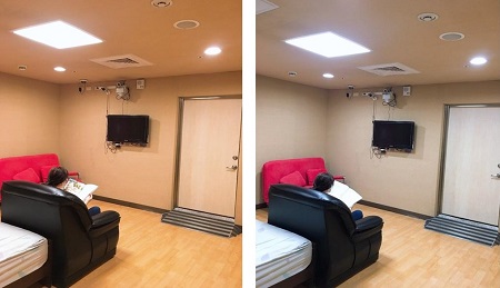 圖說3.高醫睡眠中心裝置的「無線睡眠腦波驅動喚醒前後光照警覺度及平衡感健康促進系統」,具有適合人體工學的照度和色溫,透過暖色光(左)及冷色光(右)等不同光源,營造類大自然光源,可改善睡眠障礙。