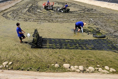 圖2:國立中山大學機械與機電工程學系副教授林韋至率領研發團隊打造省力機具,於水蓮池示範人工種植和使用電動種植機對照種植情況。