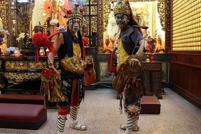 【記者吉雄世/高雄報導】猙獰威風、神秘莊嚴的八家將可說是最具臺灣本土特色的陣頭,但近年來常被大眾戲稱為8+9,並與社會黑暗面、不法分子劃上等號。國立中山大學中文系「家將文化探索體驗課程」以這被誤解最多的文化「家將」為主題,讓學生了解民間信仰裡不同脈絡的塗面扮神將文化,進而對臺灣獨具魅力的家將文化有更深入的認識和瞭解。課程內容不僅讓學生了解家將的藝陣特色,更實際粉墨登場、開臉出軍,授課教師、中山中文系主任羅景文也親自擔任「刑具爺」角色。